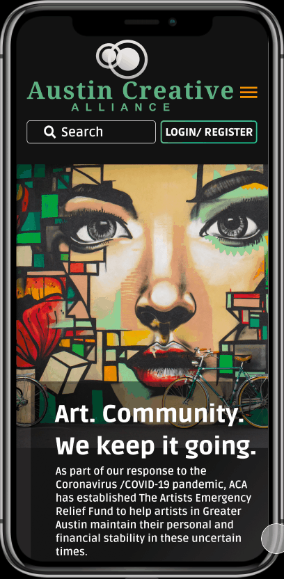 The COVID-19 pandemic has brought artists more hardship than ever. Due to the shutdown of live showcases, nearly all public events, and consequent lack of networking opportunities, artists are desperate for relief options to both help them stay afloat and keep momentum going during this time of hardship. Our redesign of the Austin Creative Alliance (ACA) website simplifies the relief fund application process while providing a space for artists to showcase themselves to donors and network and collaborate with other artists.