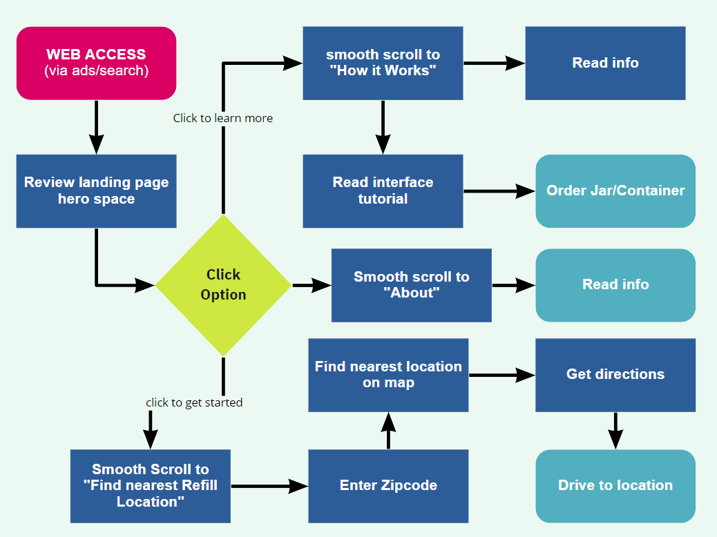 Because this concept has not yet been mainstreamed, I knew it would be important for the user to learn how to use the machine first so they would know what to expect. This way, anyone in the grocery store could walk up to the machine and be able to quickly digest the process & potentially decide to refill.