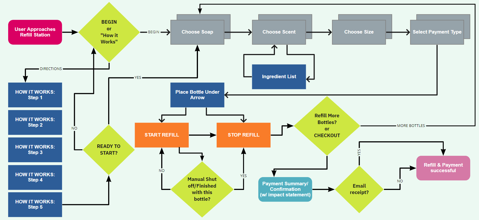 Our team is developing a grocery store refill station to empower the average consumer to reduce their plastic waste and create more sustainable habits by providing a fulfilling experience within the convenience of their everyday shopping trips.